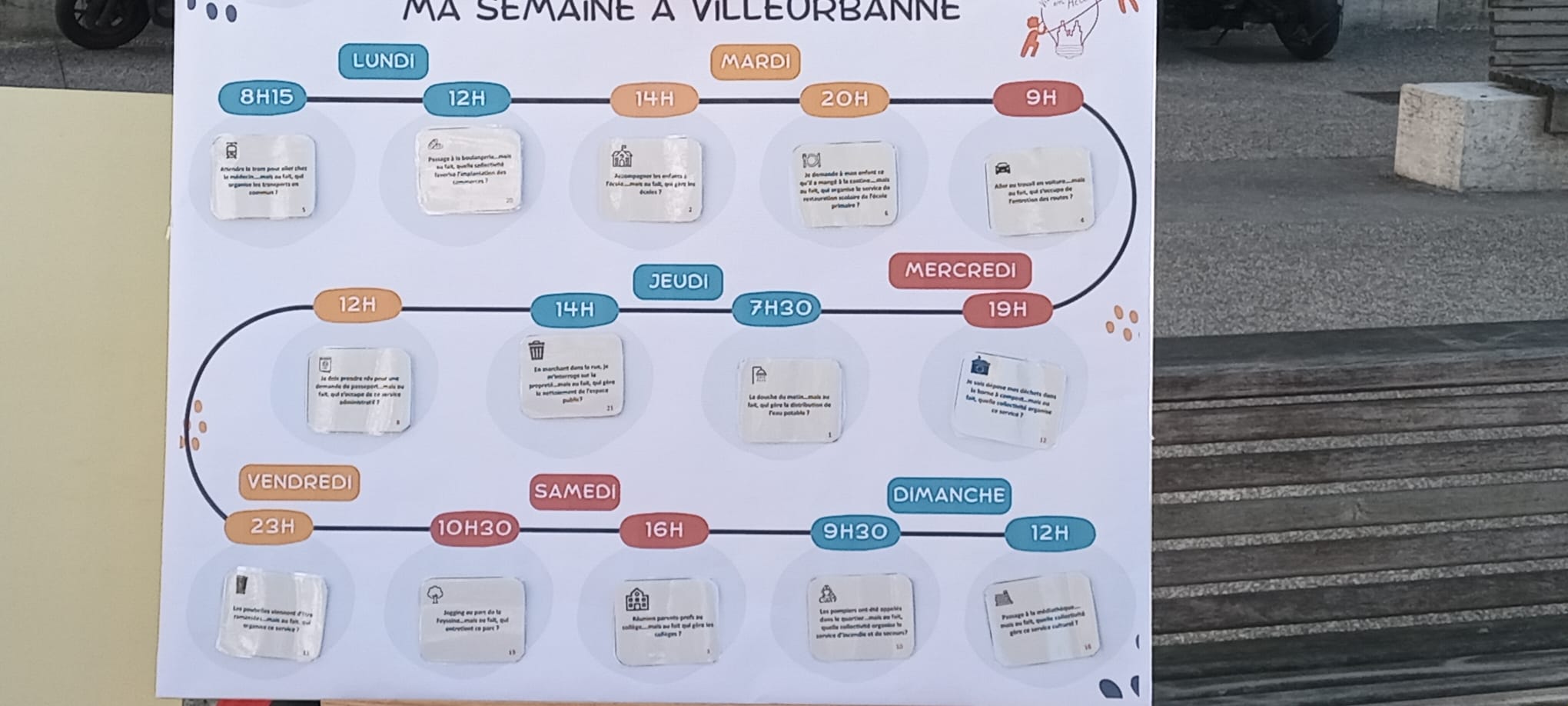 Cet atelier permet d’interpeller les habitants sur les services publics : Il s’agit de proposer aux personnes de raconter leur semaine type et de s’interroger à quelle institution dépend les actions correspondantes en particulier ville ou métropole.